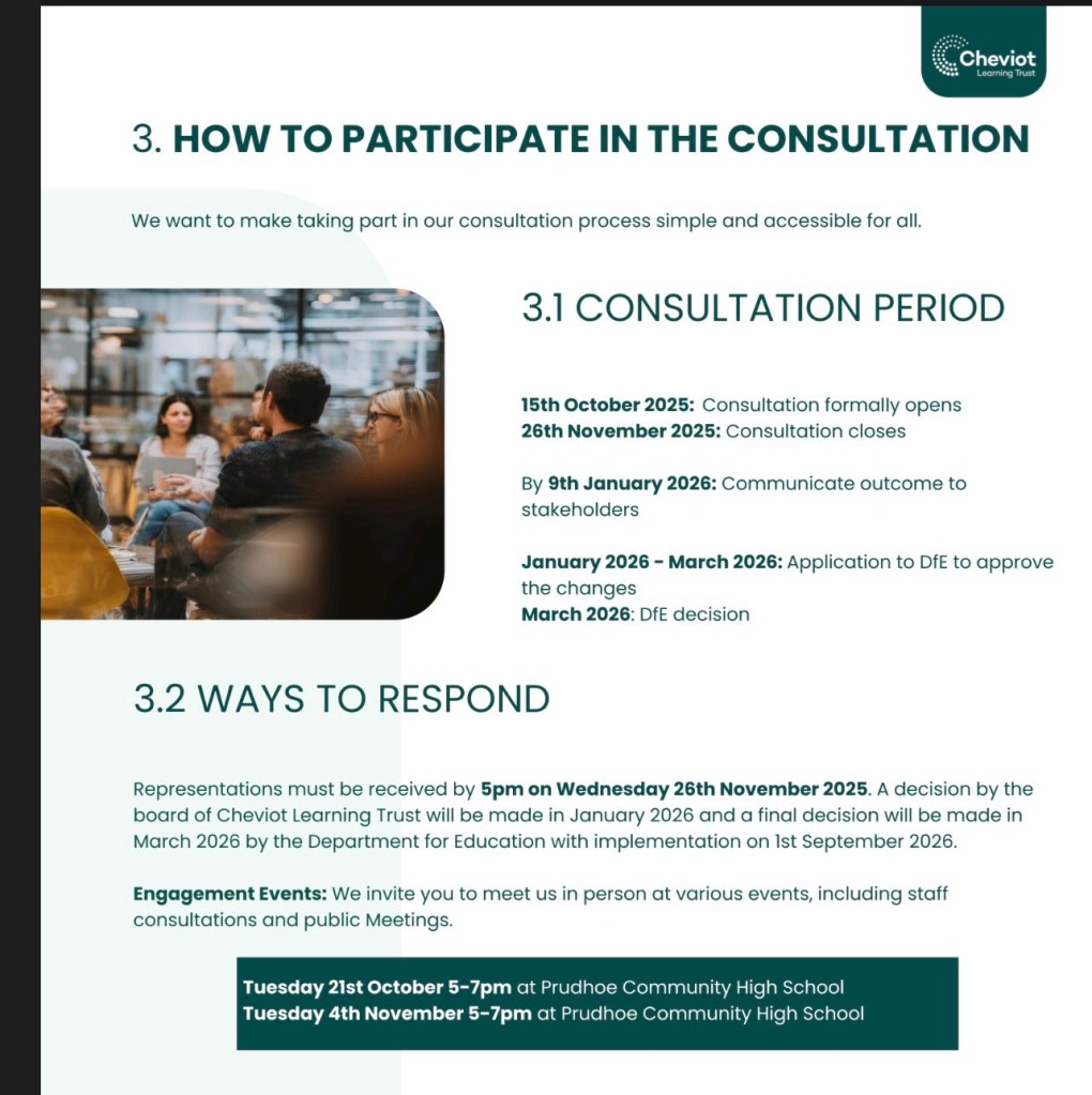 ** There are other (First / Primary) Schools in Prudhoe which are part of other trusts and are not impacted by the consultation.