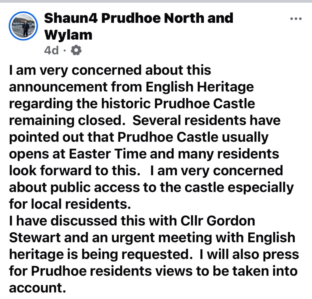 Thank you for getting in touch about the changes to the opening arrangements at Prudhoe Castle………..